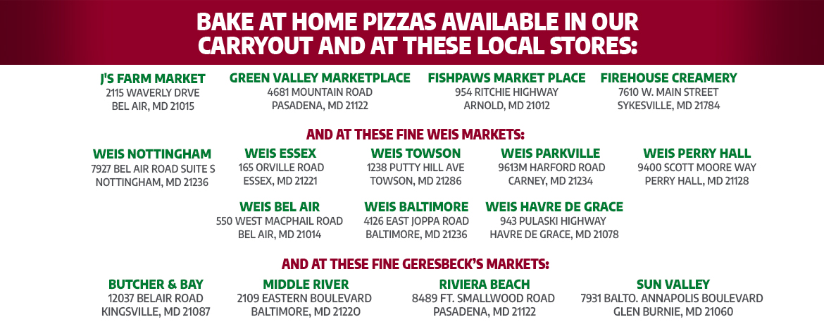 Our delicious pizza is also available at Oriole Park at Camden Yards and your local grocer (see below).